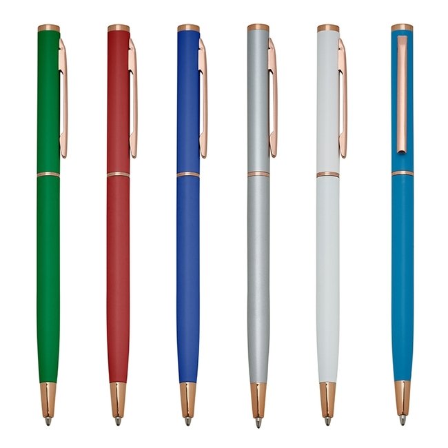 Descrição: Caneta metálica com carga esferográfica azul e acionamento por rotação.